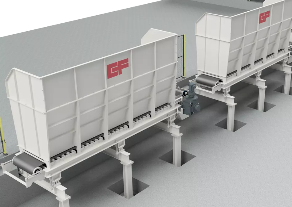 - Available steel slat bottoms or rubber belt for fine dry materials with scraper